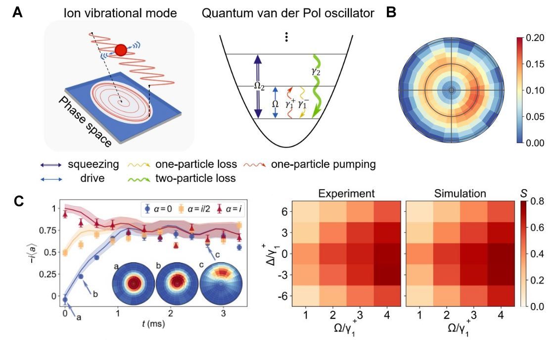 研究团队基于离子阱系统,以单个钙离子的轴向振动模式模拟量子谐振子,通过耗散工程方法引入可控的自旋-振子耦合,从而构造出所需的线性和非线性阻尼项。实验采用时序化操控,结合相干驱动与耗散操作,实现了量子范德波尔振子的有效动力学。