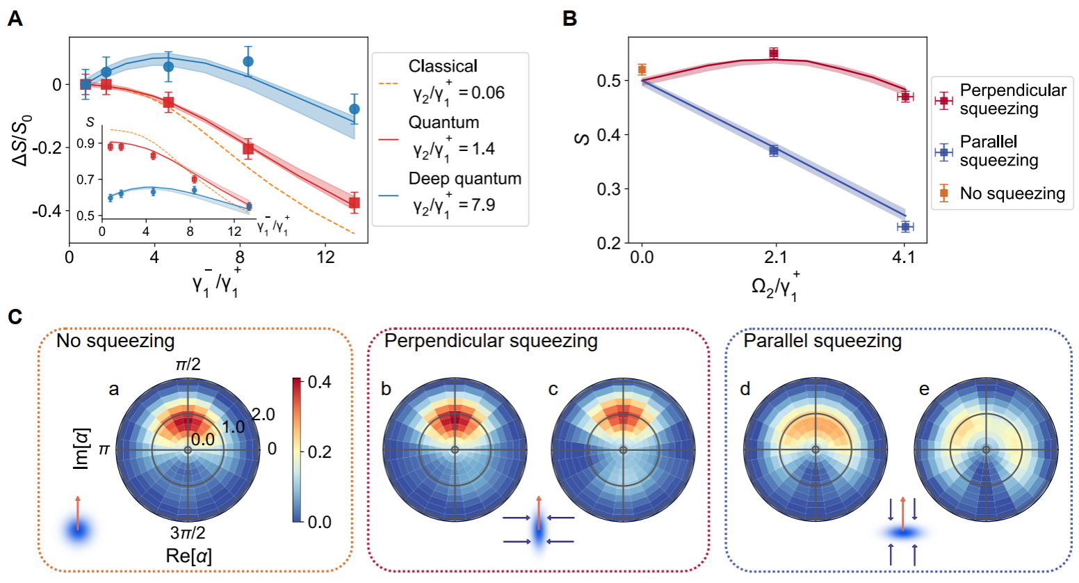 图2:耗散与压缩对量子同步的增强效应。(A)在深量子区域中,适度的线性耗散对同步具有增强作用。(B)同步强度随不同方向压缩强度的变化关系。(C)对应量子态的Wigner函数分布,适量垂直于相干驱动方向的压缩可有效增强同步,而平行驱动方向的过强压缩则会引发分岔现象,导致同步的破坏。