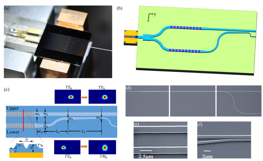 图1. (a) 电泵浦偏振纠缠光子源实物图;(b) 混合集成示意图;(c) 波导结构与光场模式分布;(d) 薄膜铌酸锂芯片扫描电镜图;(e) 双通道PPLN波导电镜图;(f) 偏振旋转合束器电镜图。