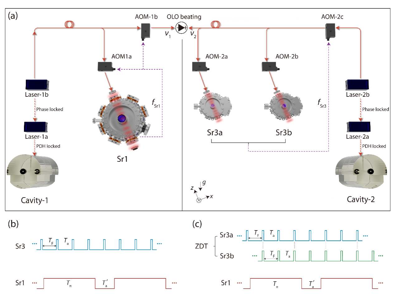 图1.锶原子光钟Sr1和Sr3,其中Sr3由双物理系统组成,并交替运行。Sr1、Sr3两个独立光钟之间开展了频率比对