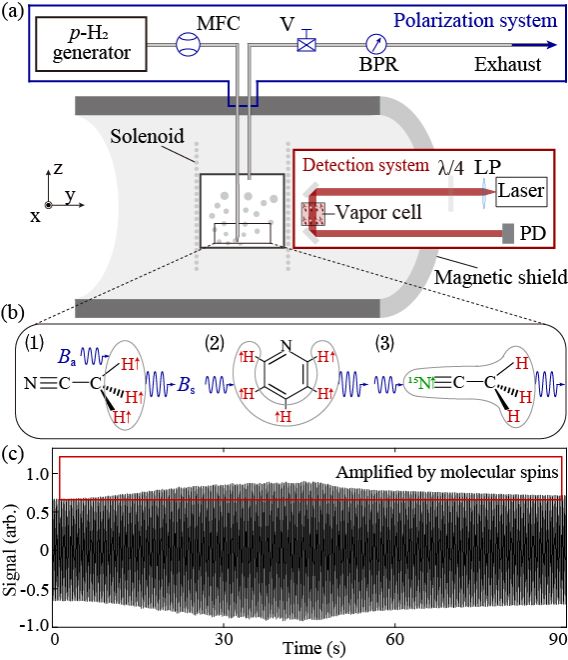 中国科学技术大学自旋磁共振实验室彭新华教授、江敏教授及其合作者,系统发展了分子核自旋的超极化技术,并提出将其用于量子传感的新方法,首次实现了基于超极化分子核自旋的磁场信号放大,将核自旋对微弱磁场的响应能力至少提升了四个数量级。相关研究成果以Hyperpolarized Molecular Nuclear Spins Achieve Magnetic Amplification为题于2026年4月2日在线发表于《物理评论快报》(Physical Review Letters)。